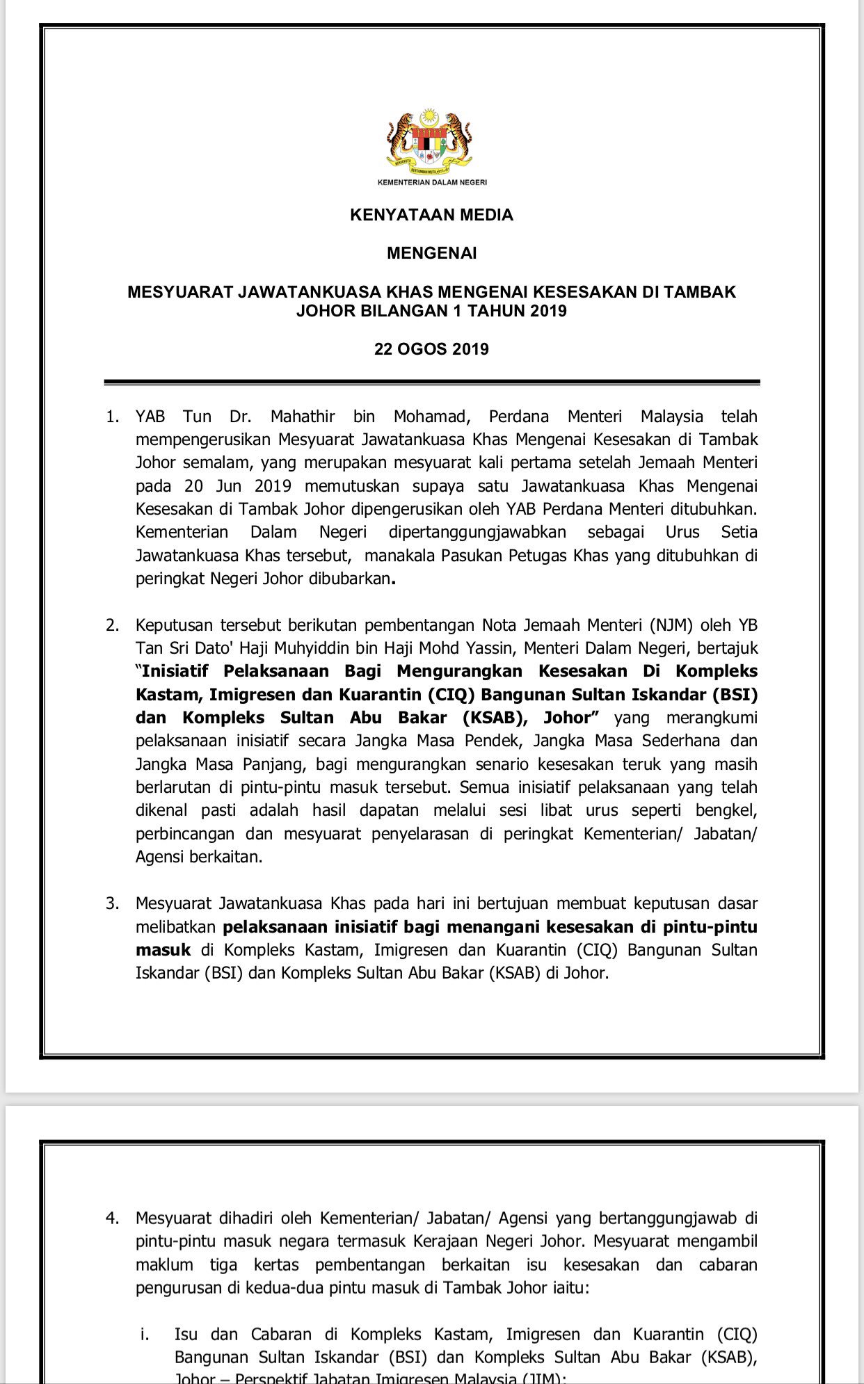 Melissa Goh On Twitter Home Ministry To Set Up A Single Border Agency To Control All Entry Points A Committee Will Look Into Ways To Ease Congestion At Johor Causeway Incl