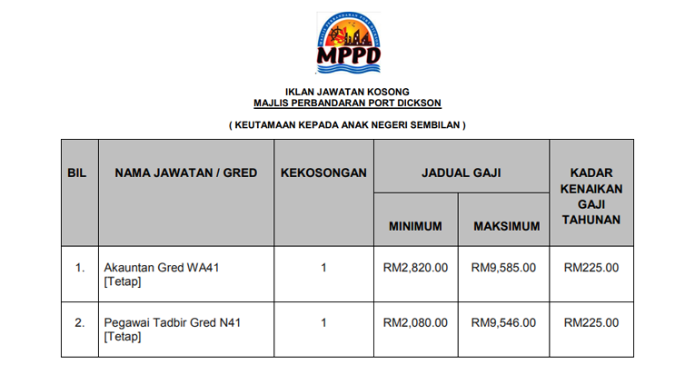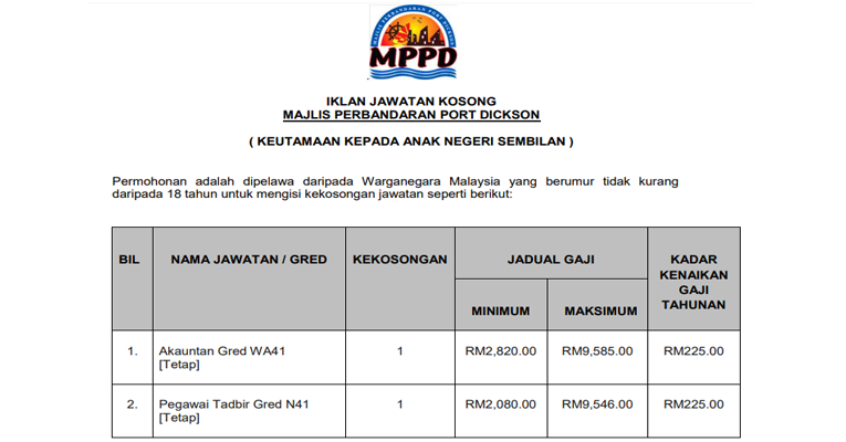 By creating a job alert or receiving recommended jobs you agree to our terms. Assalamualaikum dan salam sejahtera khas buat warga pd dan anak anak negeri sembilan majlis perbandaran port dickson mppd ada mengiklankan 9 jawatan kosong dengan 17 kekosongan untuk diisi. Permohonan jawatan kosong di majlis perbandaran port dickson mppd dialukan memohon dan mempelawa kepada warganegara malaysia yang berkelayakan dan berumur tidak kurang dari 18 tahun pada tarikh tutup iklan jawatan untuk mengisi kekosongan jawatan tetap kontrak seperti berikut.