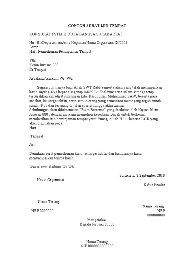 Peminjaman contoh surat permohonan izin penggunaan tempat. Terdapat kop surat tanggal dan tempat surat dibuat kepada siapa surat ditujukan isi surat peminjaman tempat yang jelas mengenai kapan dan untuk apa tempat akan dipinjam dan digunakan serta tercantum dengan jelas siapa yang membuat surat peminjaman. Nah bagi anda yang ingin menulis surat ini alangkah baiknya anda memperhatikan kosa kata dan penulisannya yang baik dan benar agar dalam membuat contoh surat izin peminjaman tempat ini bisa anda terapkan dengan baik sebagai refrensi. Permohonan izin tempat kepada yth. Atas perhatian dan izin yang diberikan kami ucapkan terima kasih.