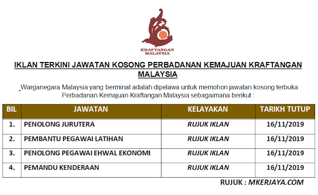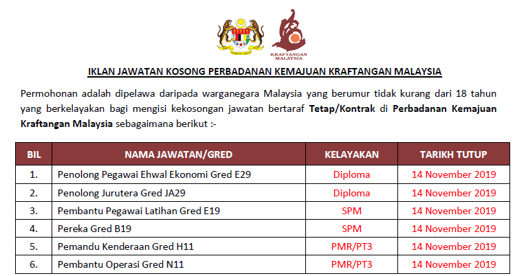 Jawatan Kosong Perbadanan Kemajuan Kraftangan Malaysia Tarikh Tutup 14 November 2019 Jawatan Kosong Kerajaan 2020 Terkini