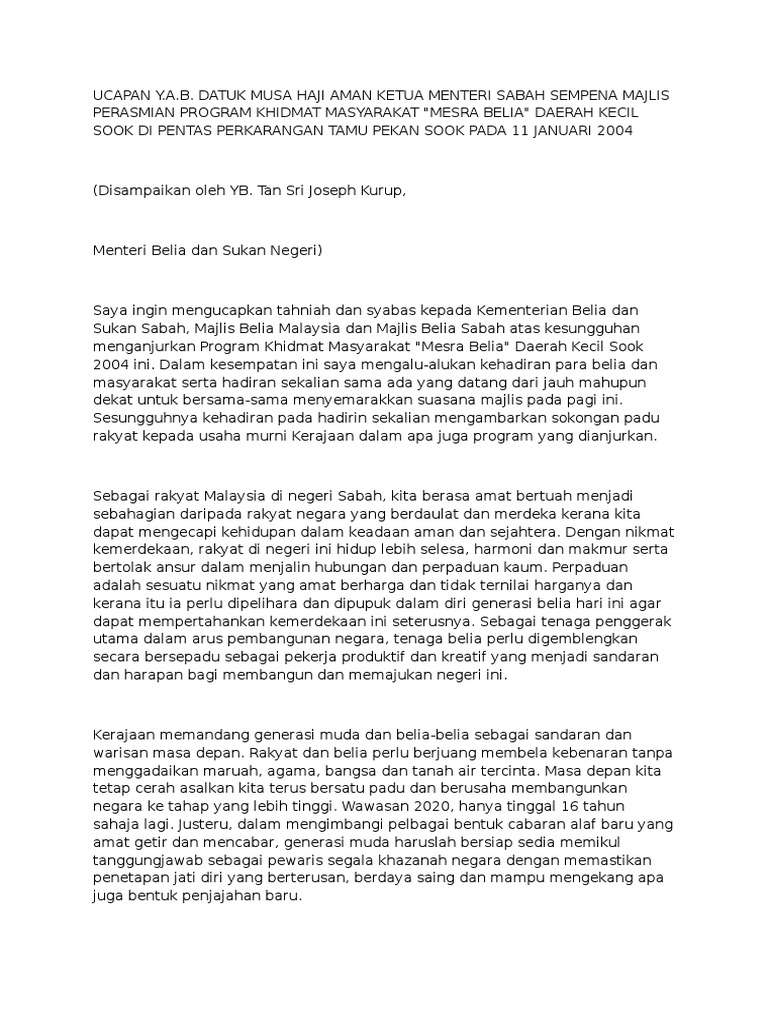Teks ucapan yb dato sri rohani abdul karim menteri pembangunan wanita keluarga dan masyarakat majlis perasmian program jom kamboh perintah khidmat masyarakat jabatan kebajikan masyarakat 21 oktember 2017 sabtu dewan suarah seri aman sarawak. Pihak majlis merakamkan ucapan jutaan terima kasih atas ucapan sebentar tadi. Teks ucapan perasmian speakers corner yang berbahagia. Dewan sekolah kebangsaan sri neting tumpat pengkalan kubor kelantan.